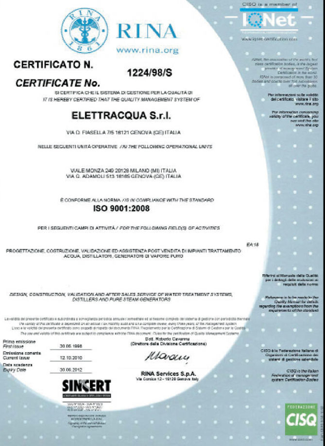 certified company since 1998 for "Design, constructions validation and after sales service water treatments systems, distillers and pure steam generators"